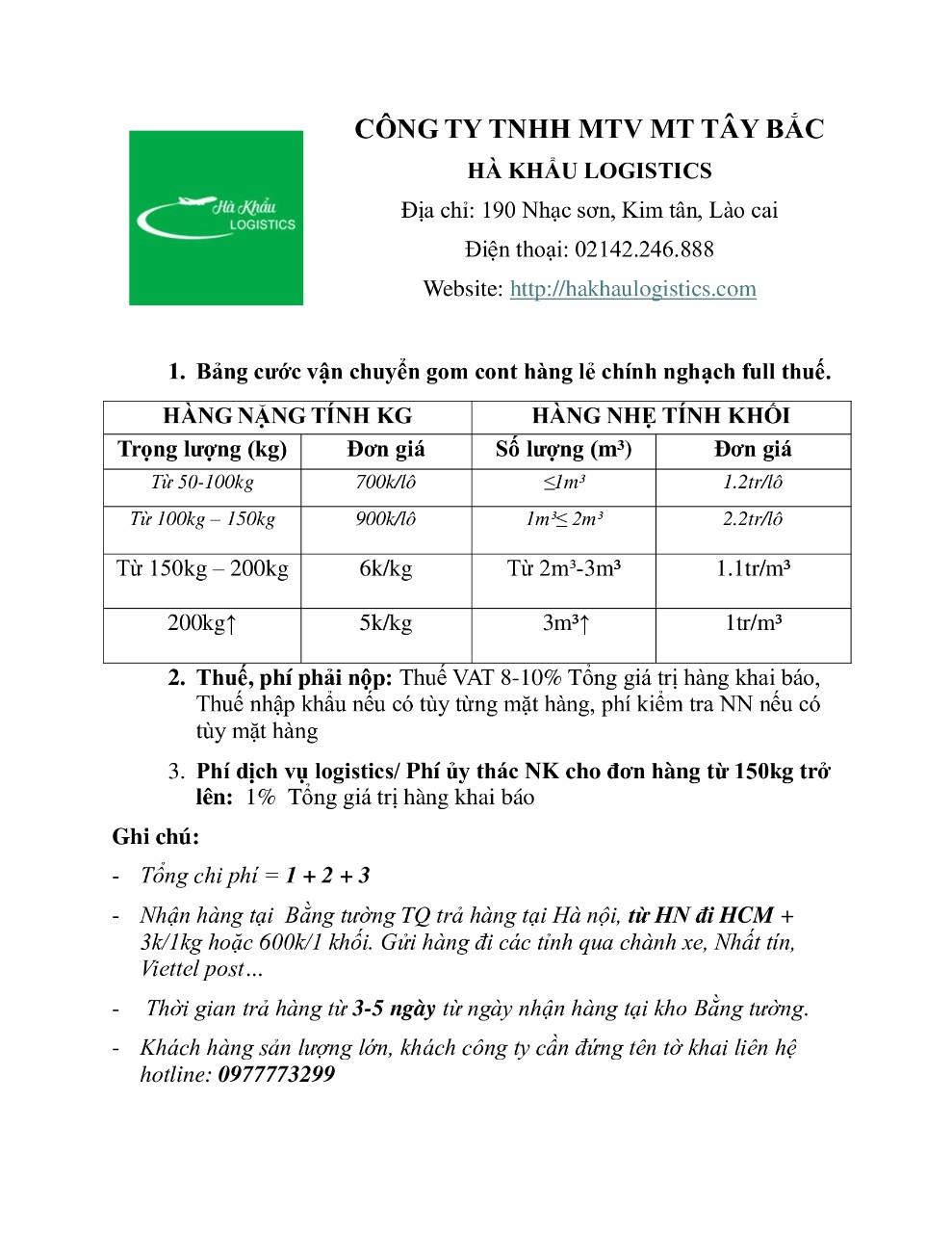 BẢNG GIÁ VẬN CHUYỂN GOM CONT HÀNG LẺ CHÍNH NGHẠCH ĐƯỜNG BỘ